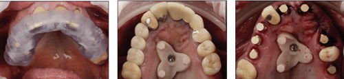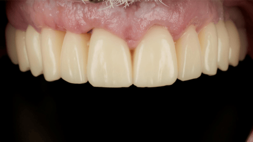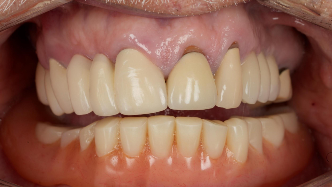 Implant positions were indexed to the archived diagnostic design, enabling a same-day, digitally fabricated conversion prosthesis requiring no luting or bite adjustment. The provisional functioned as both a healing appliance and a prototype for the final restoration.