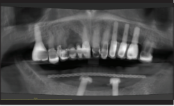 The patient presented with a history of dental implants in the maxillary and mandibular arches. The remaining maxillary dentition exhibited failure, chronic infection, and inflammation.
